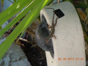 Initially I thought that the lizards were iguanas (as local people called them) hunting for mosquitos, but, after talking to people taking care of iguanas (here in Berkeley), I learnt that iguanas are vegetarian. However, Iguanas need to have two temperatures: one hot around 96 °F, and another cold, not less than 75 °F. Below the cold temperature (75 °F) the iguana's metabolism slows, and therefore, they will use the lamp to keep warm at sunset.