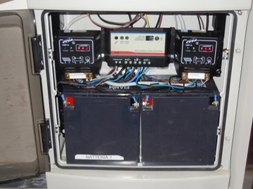 The pictures describe an implementation to power automation and burglar alarm systems using solar cells, the power supplies are used as backup when needed. The charge condition of the batteries are constantly monitored by solar charge controllers to improve operation during long black out times and periods of poor sunlight.