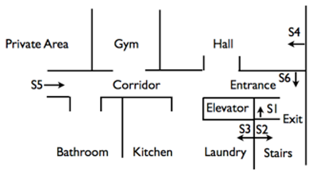 The figure above shows the location and pointing direction of the six sensors in an apartment. S1 covers the elevator hall. S2 covers the stairs. S3 covers the access to the services area composed of kitchen and laundry rooms. S4 covers the access to living and dining rooms. S5 covers the presence in the corridor, and S6 covers the access to the entrance. An event is generated every time a sensor is triggered by motion.