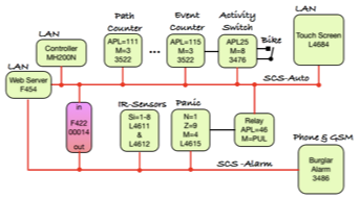 Burglar Alarm, Automation, and Energy systems exchange information about events using OpenWebNet messages. The controller, web server, alarm station, and home assistance services work in synergy to process events and logical conditions, identifying incompleted tasks to initiate calls and send mails alerting providers or relatives.